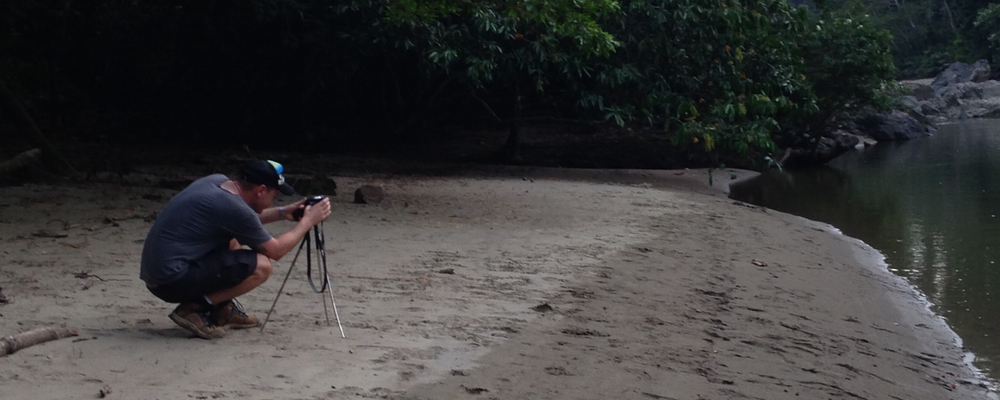 Das Bild zeigt Vincenzo im Jahr 2014 beim Aufstellen eines Zoom h2n im "Danum Valley", Borneo, Malaysia.